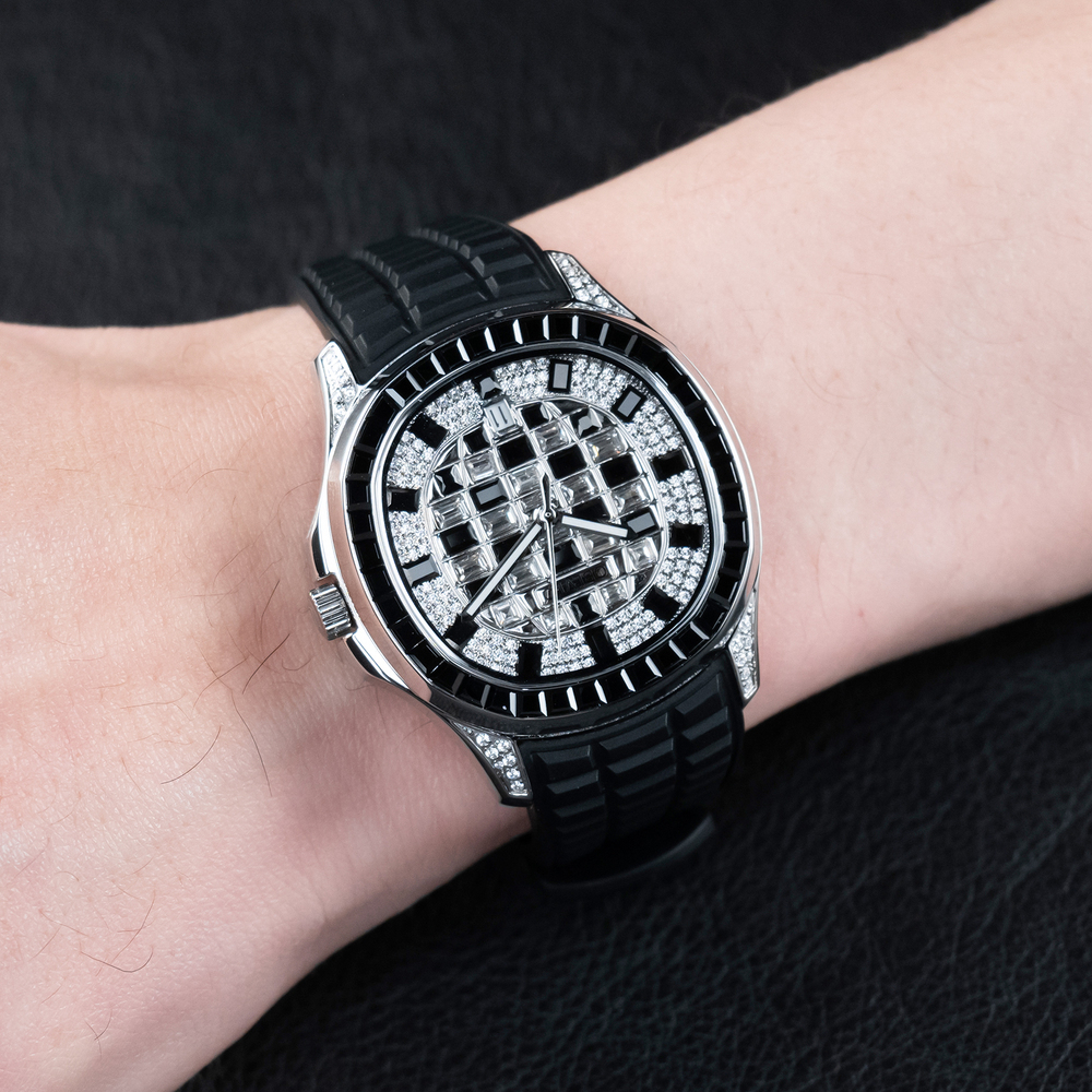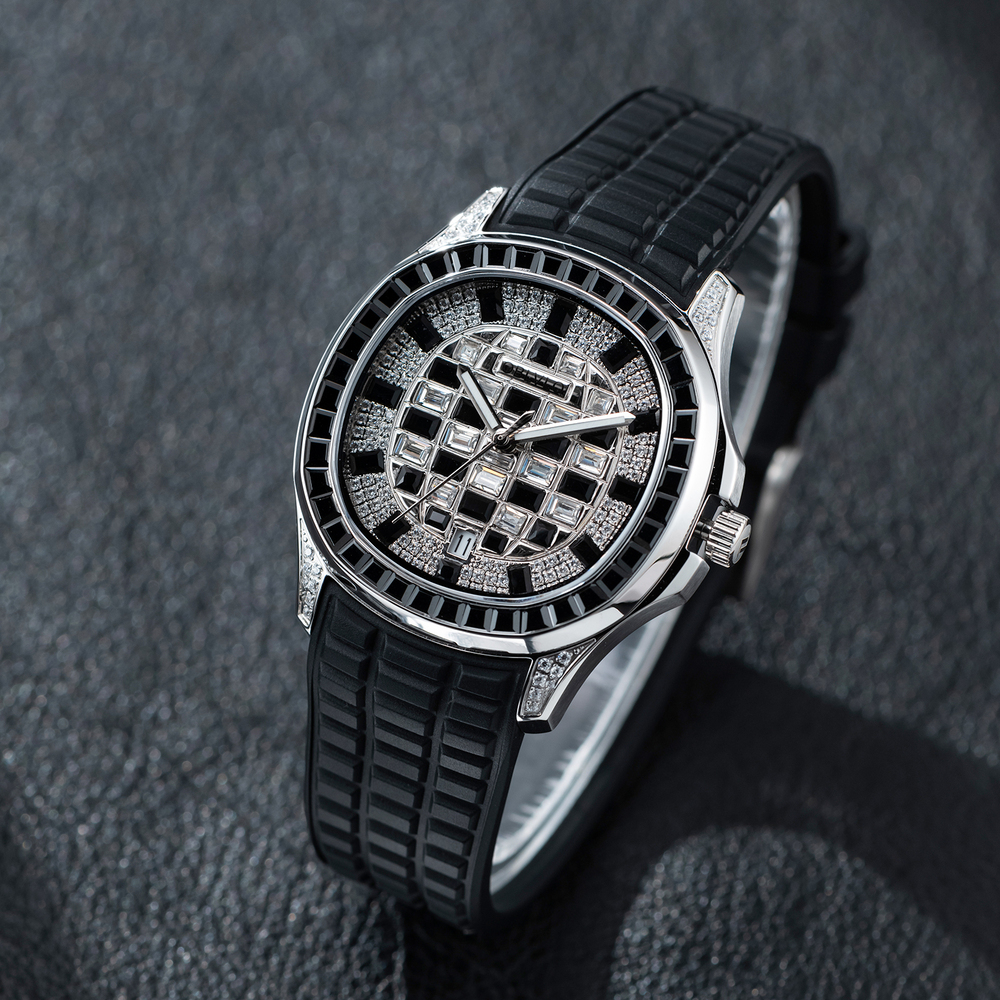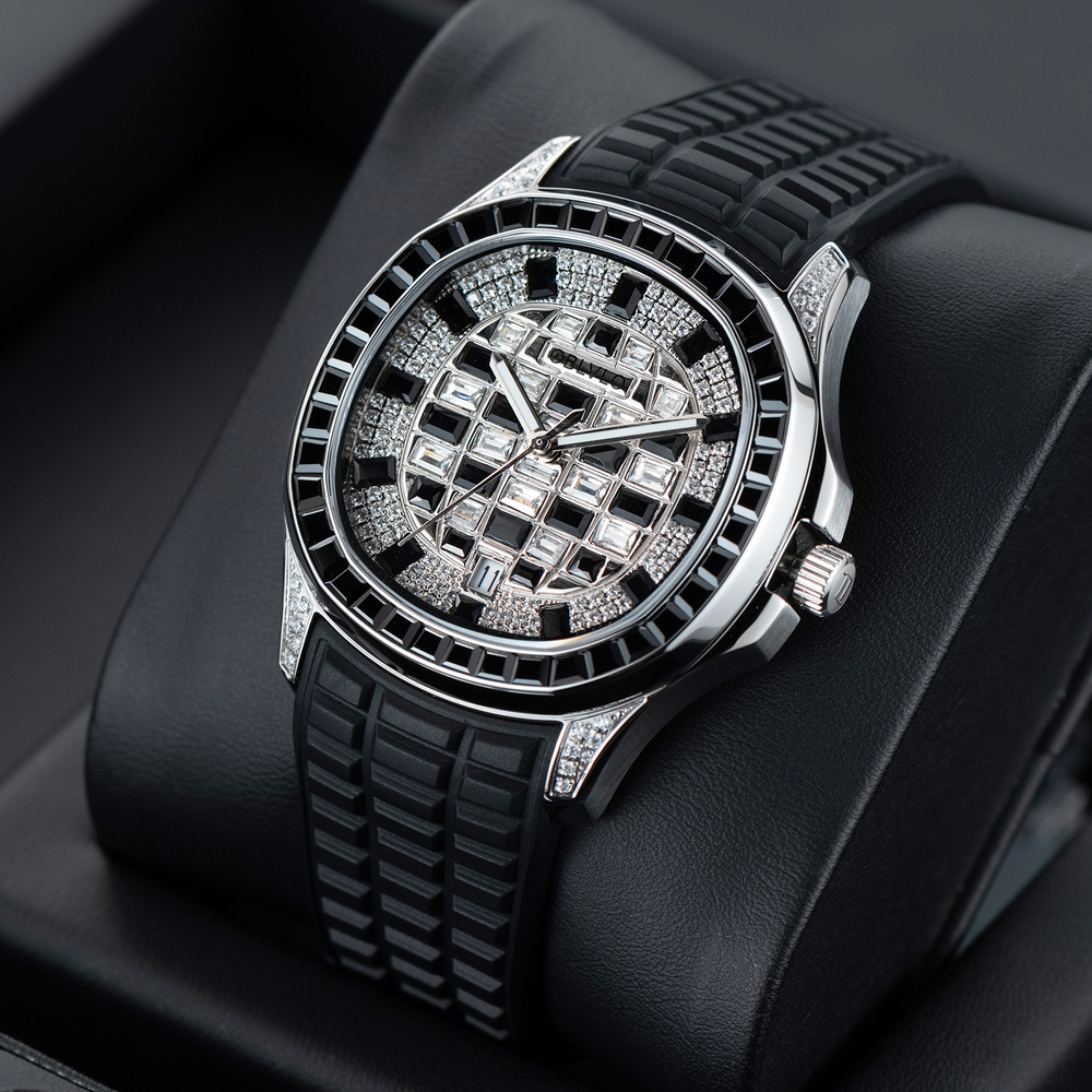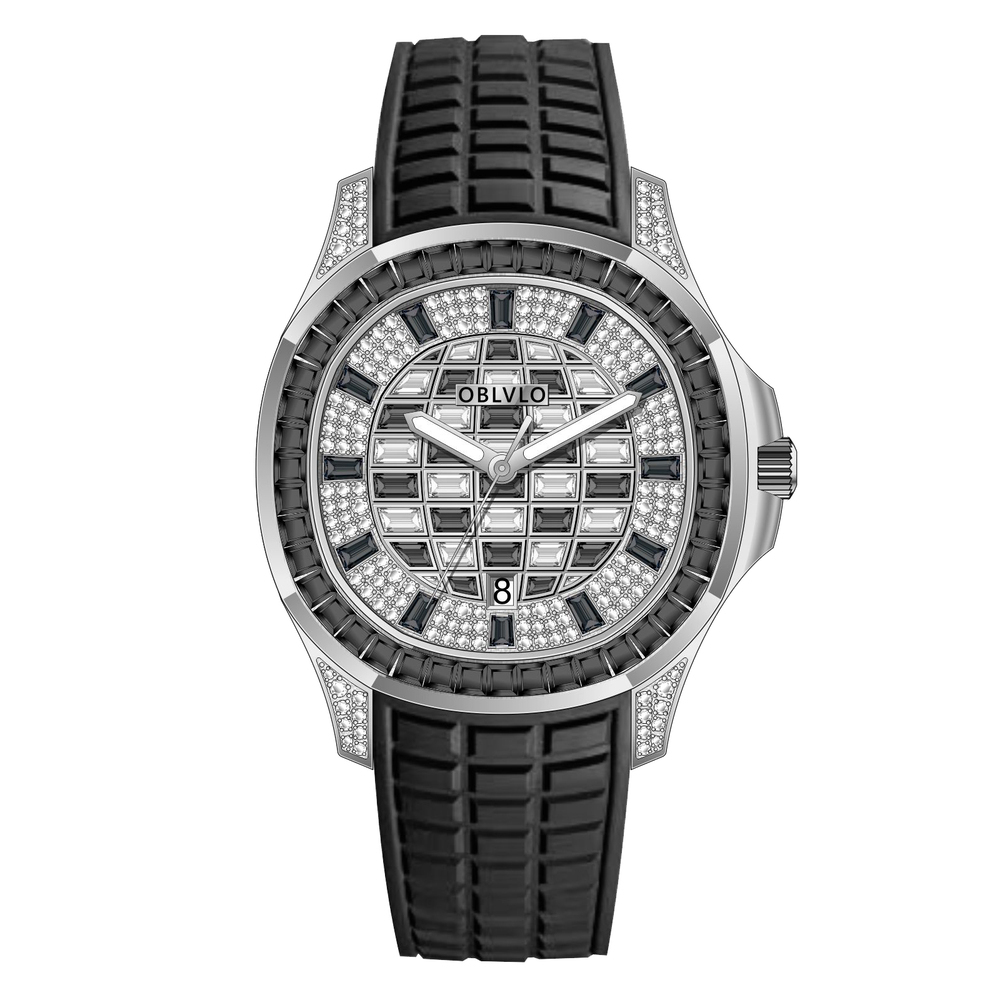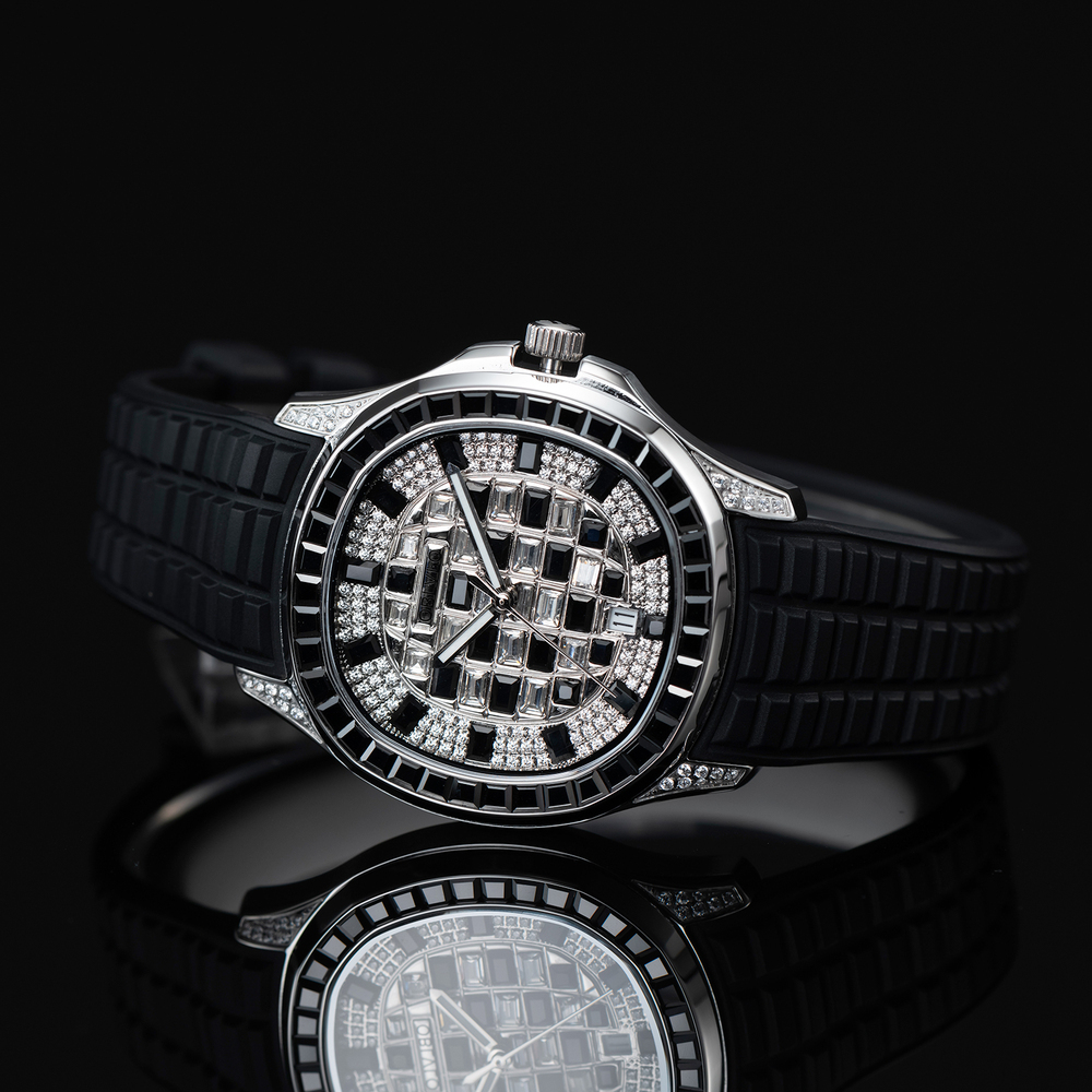 OBLVLO歐弗洛【鑽刻極境】融合極致工藝與珠寶美學的傑作,透過莫桑石與鑽石的密集排列,在藍寶石水晶錶面下構築出迷人的幾何馬賽克棋盤,形成一場關於鑽石、光線與幾何建築美學的華麗冒險。長方形切割寶石鑲邊不僅框住了流溢的光影,更定格了奢華的格律。在光影交織處,邂逅不凡。
