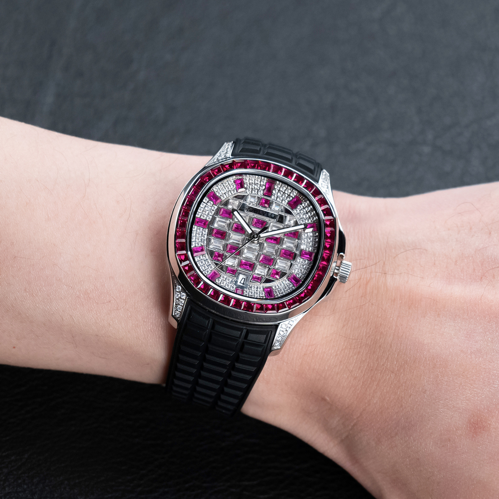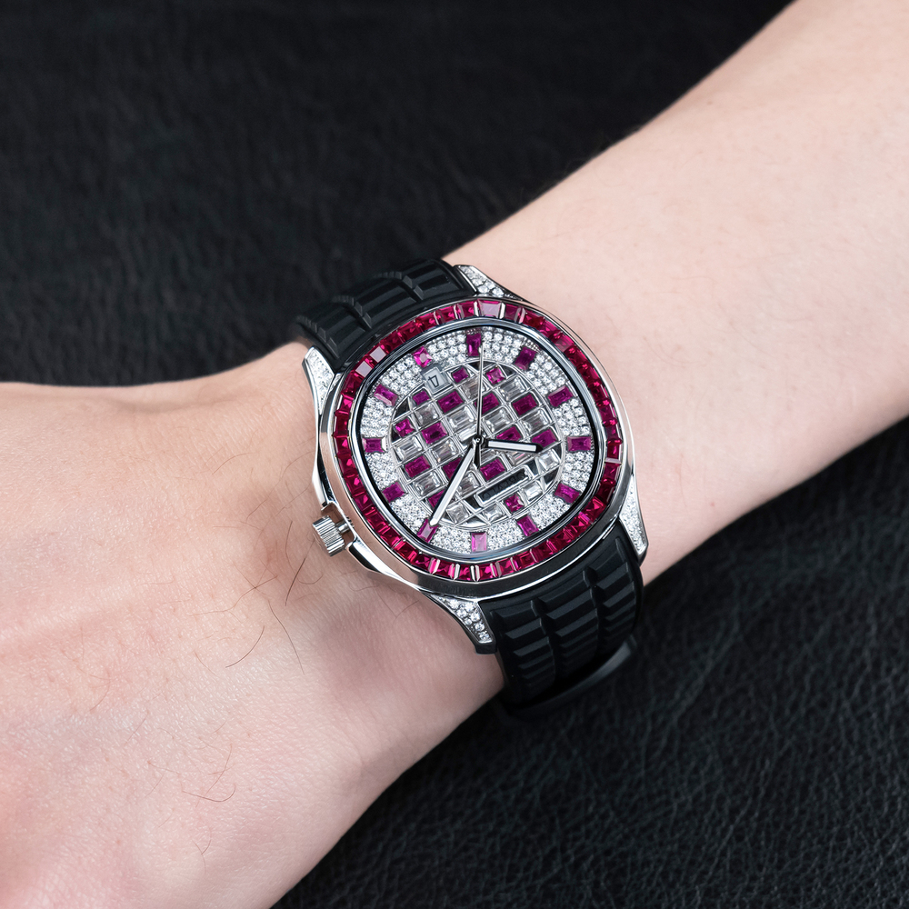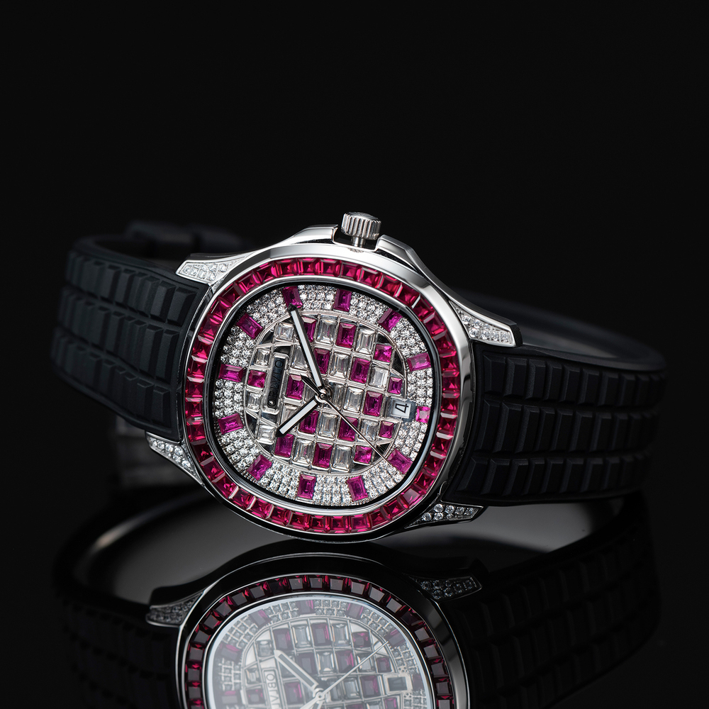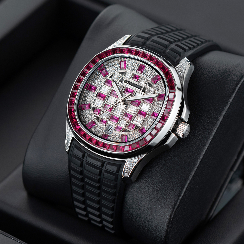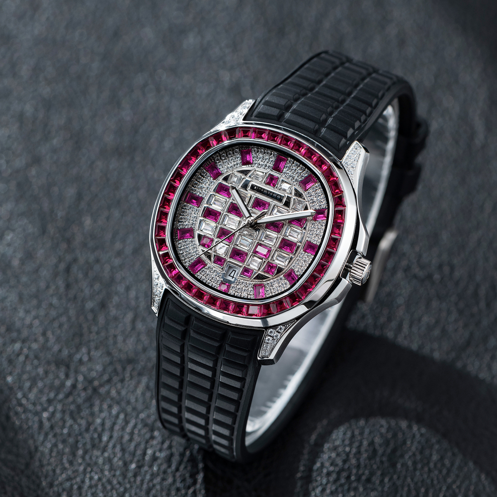 如果說錶盤是靈魂,那麼長方形切割寶石的鑲邊則是這款腕錶的風骨。相較於常見的圓形切割,長方形切割對原石質量的要求極為苛刻,且鑲嵌工藝難度極大。精選每一顆色澤飽滿、淨度無瑕的寶石,將其緊密排列於外圈。這種切割方式能展現出如同建築基石般的穩重感與俐落線條,配合錶盤內部的靈動閃耀,形成了一種「剛與柔、靜與動」的完美平衡。這圈寶石鑲邊,如同皇冠上的明珠,鞏固了佩戴者尊貴而不俗的氣場。