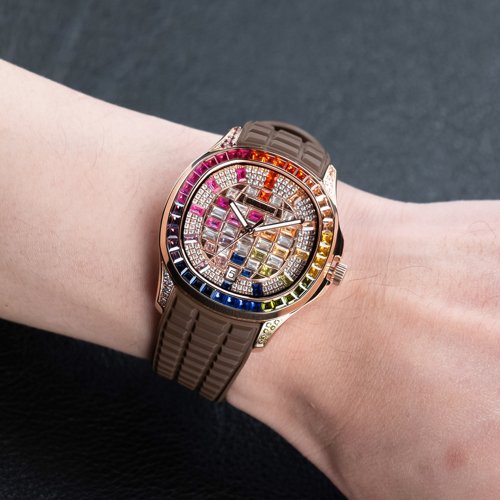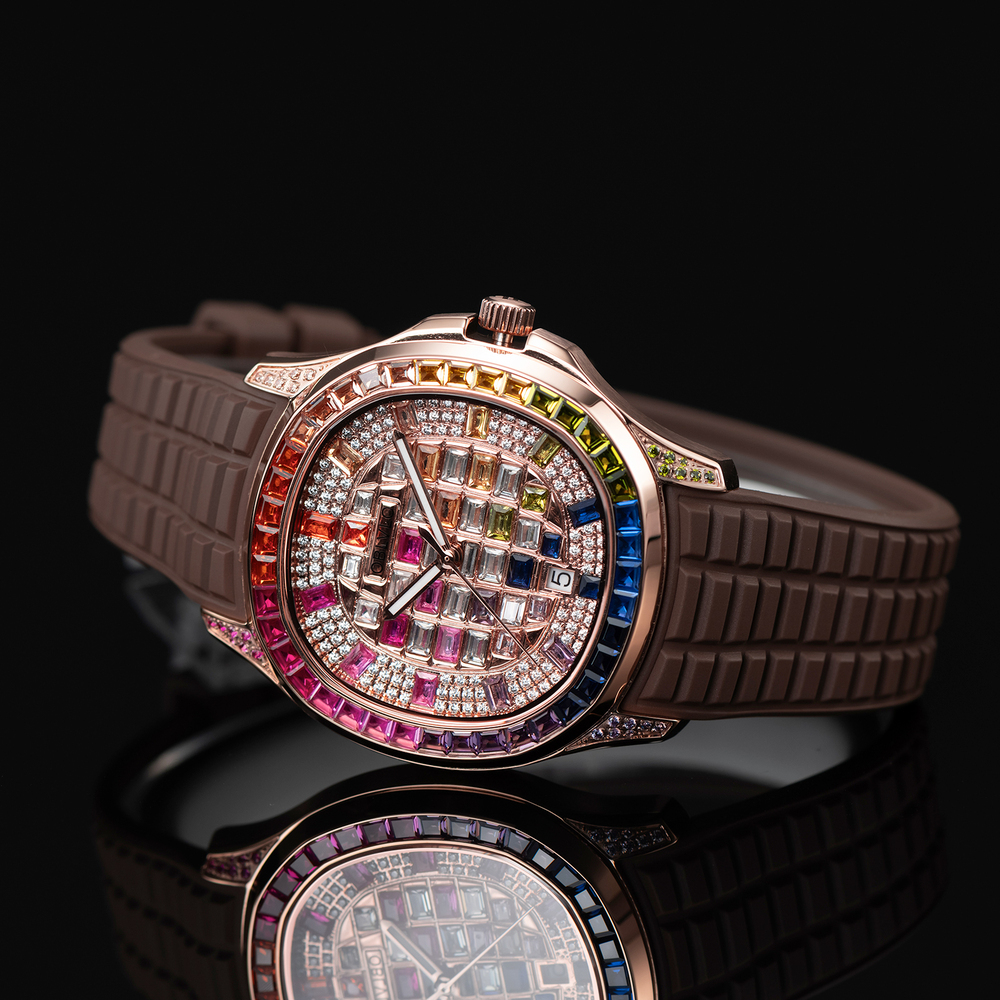 如果說錶盤是靈魂,那麼長方形切割寶石的鑲邊則是這款腕錶的風骨。相較於常見的圓形切割,長方形切割對原石質量的要求極為苛刻,且鑲嵌工藝難度極大。精選每一顆色澤飽滿、淨度無瑕的寶石,將其緊密排列於外圈。這種切割方式能展現出如同建築基石般的穩重感與俐落線條,配合錶盤內部的靈動閃耀,形成了一種「剛與柔、靜與動」的完美平衡。這圈寶石鑲邊,如同皇冠上的明珠,鞏固了佩戴者尊貴而不俗的氣場。