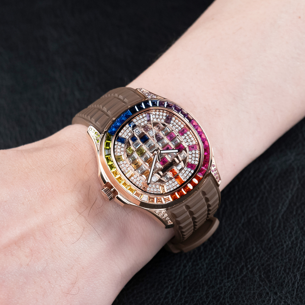 錶盤滿綴引人注目的頂級鑽石與莫桑石水晶。莫桑石水晶以其超越天然寶石的色散值,與鑽石的純淨光澤相互輝映。每一顆莫桑石都經過精密計算的切割與鋪鑲,確保光線進入錶盤後,能經歷千百次的折射與反射,最終化作萬丈虹光,在您的腕間綻放。不單單只是靜止的飾品,而是一個會隨光影流動的微型劇場。