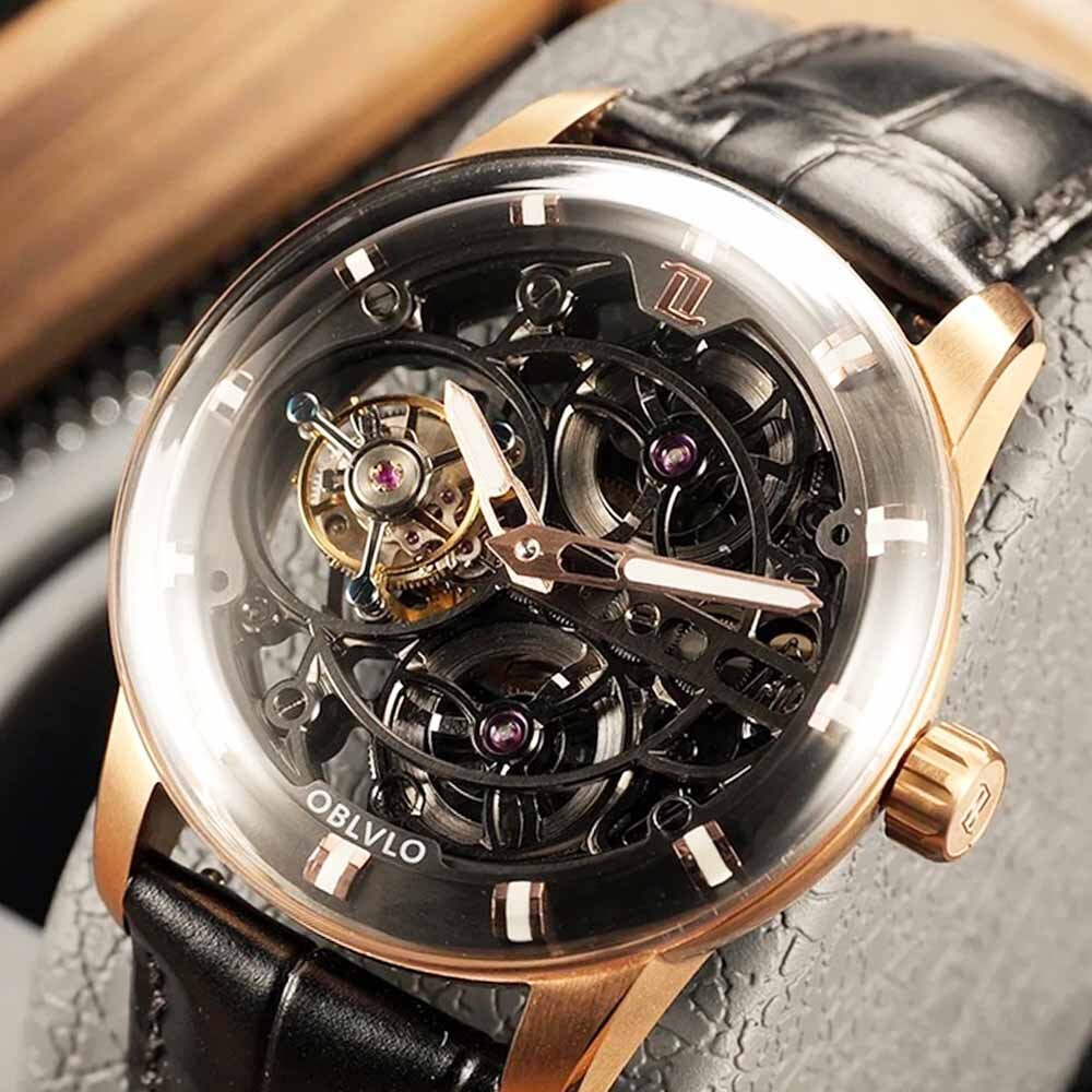 OBLVLO 歐弗洛【穹頂之光】立體陀飛輪系列,採用了大穹拱型藍寶石水晶鏡面,不僅展現卓越透光性與抗刮性能,更在每個角度下折射出不同層次的光影變幻,讓腕錶隨著光線移動展現萬千氣息。【穹頂之光】系列採用手動上鏈鏤空機芯搭配陀飛輪裝置,在設計上毫不妥協地將傳統工藝與現代藝術完美融合。大膽細膩的鏤空錶盤,宛如工藝迷宮,每一層齒輪、橋板、螺絲,都能在視覺中獲得清晰展現,堆疊出的層次與深度,宛如建築般壯麗精密。