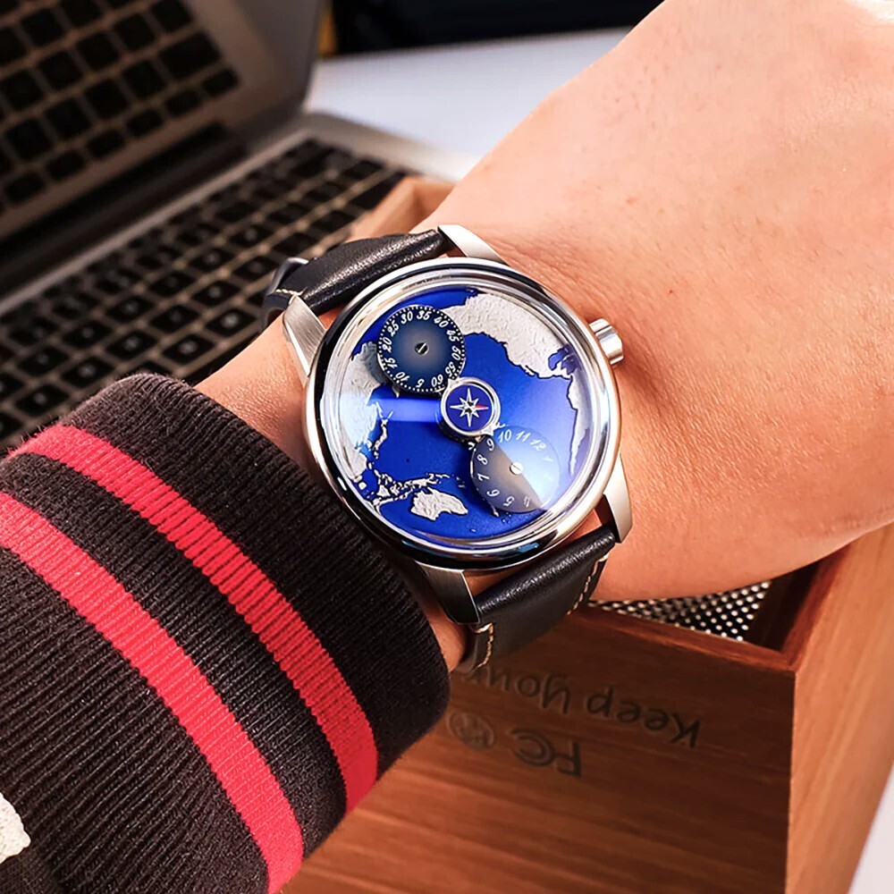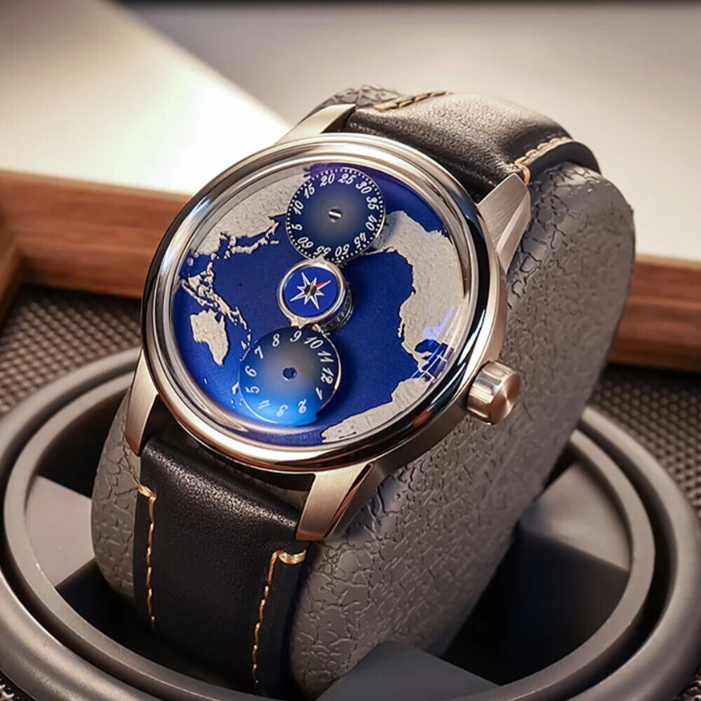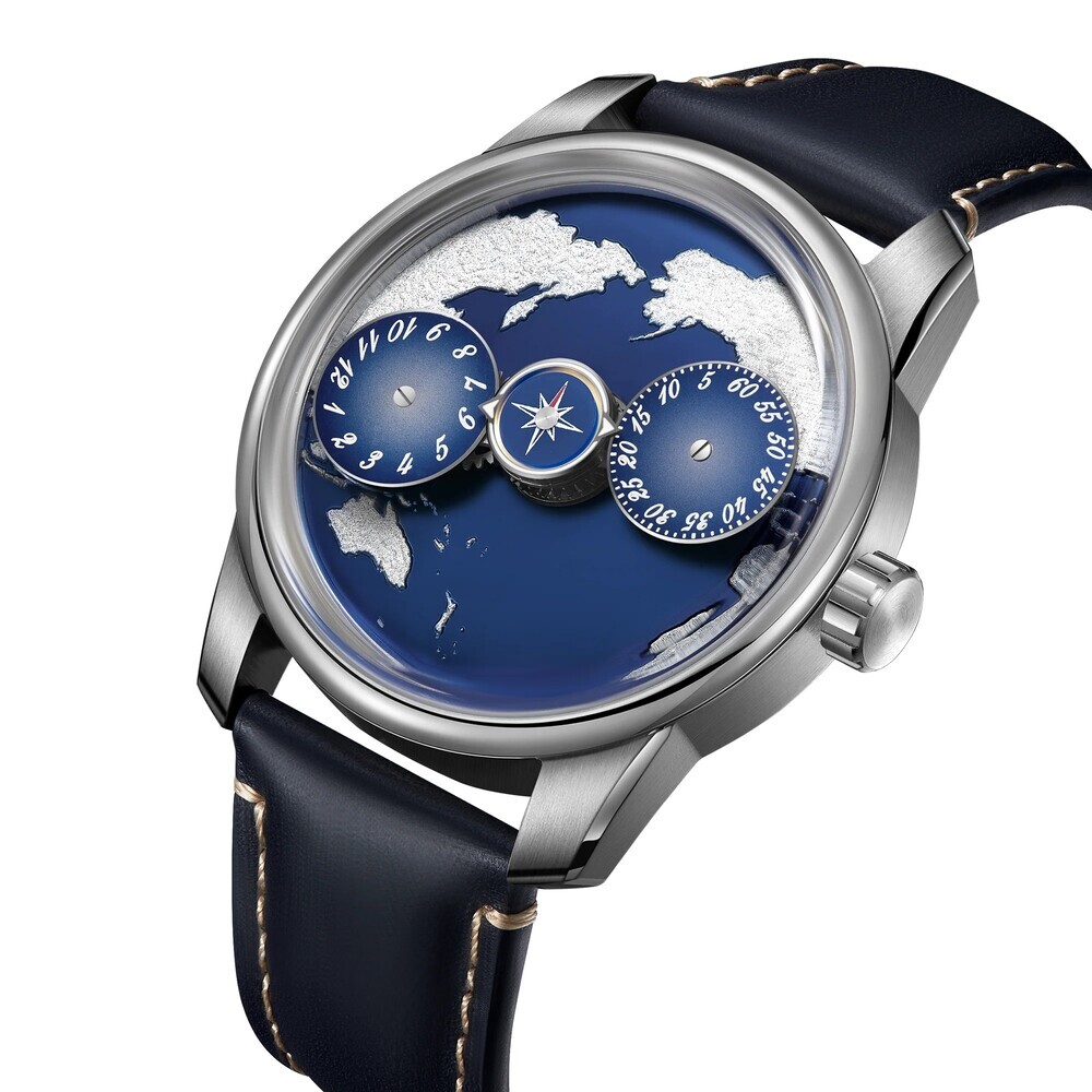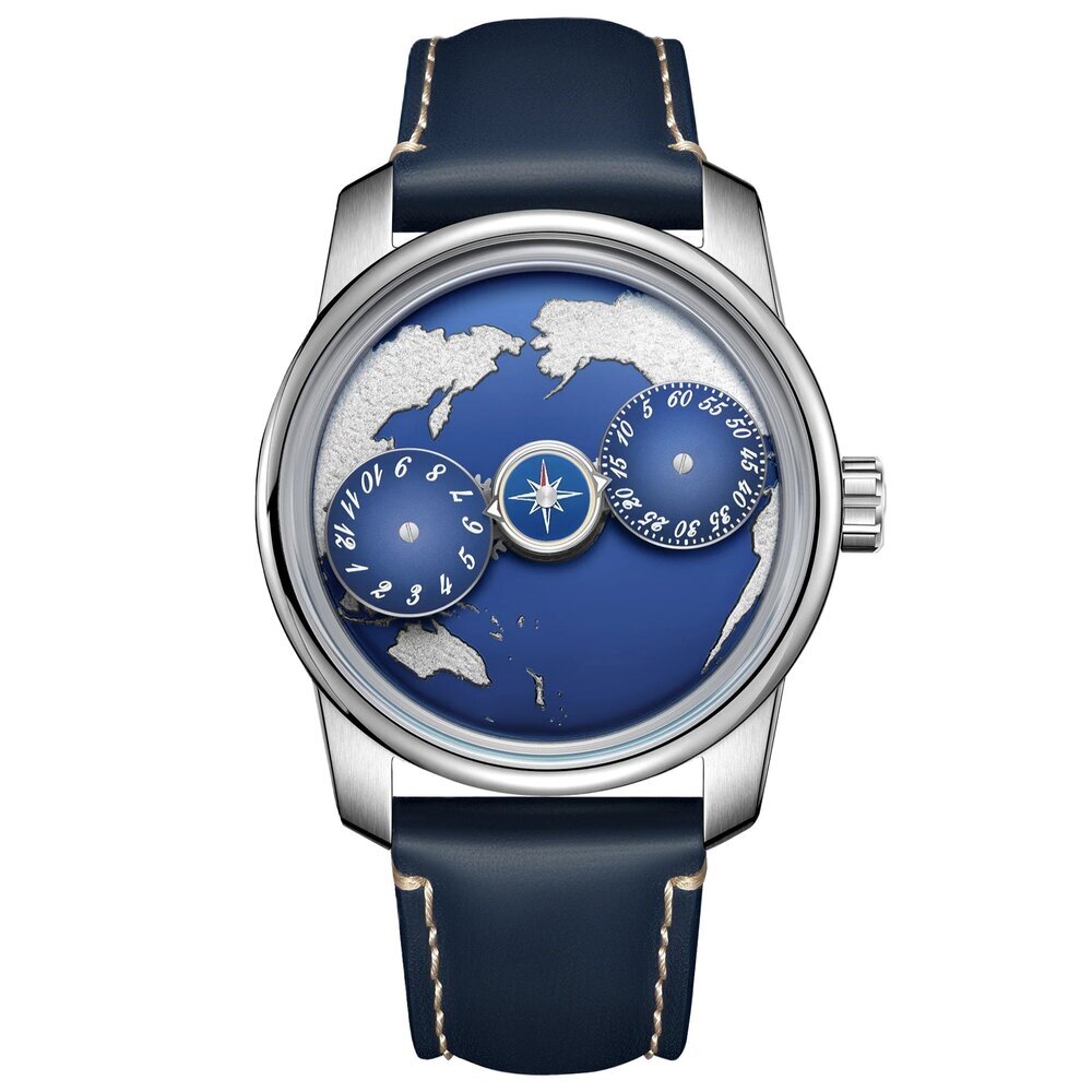 錶盤中央,是一枚深藍色的地球海洋地圖。藍,不是裝飾,而是深度—象徵人類尚未完全掌握、卻不斷試圖理解的世界。海洋在此成為時間的背景,靜默而廣闊,承載著航行、探索與未知的可能。陸地以細緻工藝浮現於藍色之上,彷彿從深海中顯影,提醒佩戴者:每一段時間的推進,都是一次跨越疆界的旅程。