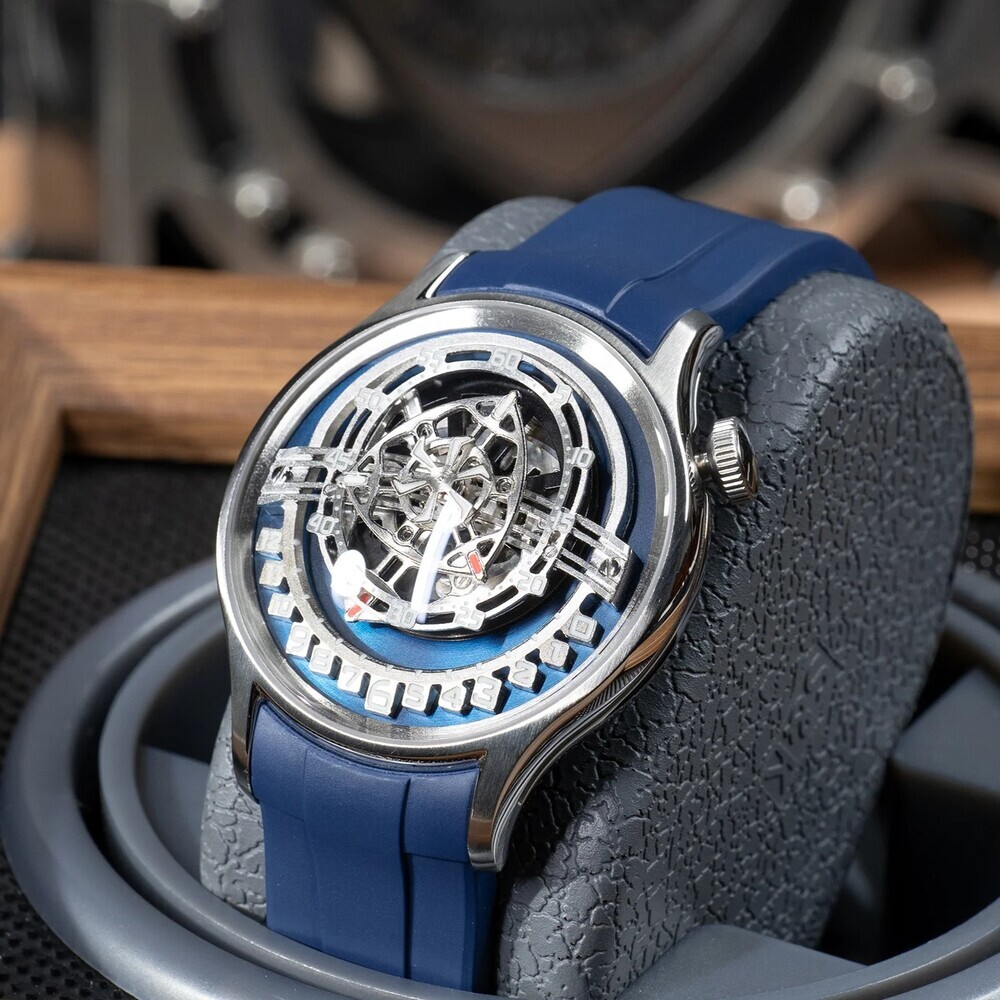 動態的雕塑: 不同於傳統腕錶枯燥的指針運轉,這款腕錶將引擎的核心零件「轉子」異化為顯時機制。銀色金屬框架展現出冷峻的工業質感,隨著時間的流逝,它在錶盤上優雅地旋轉,彷彿引擎正在不斷作功,傳遞著源源不絕的機械生命力。