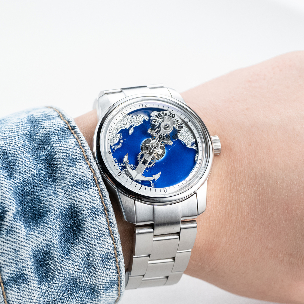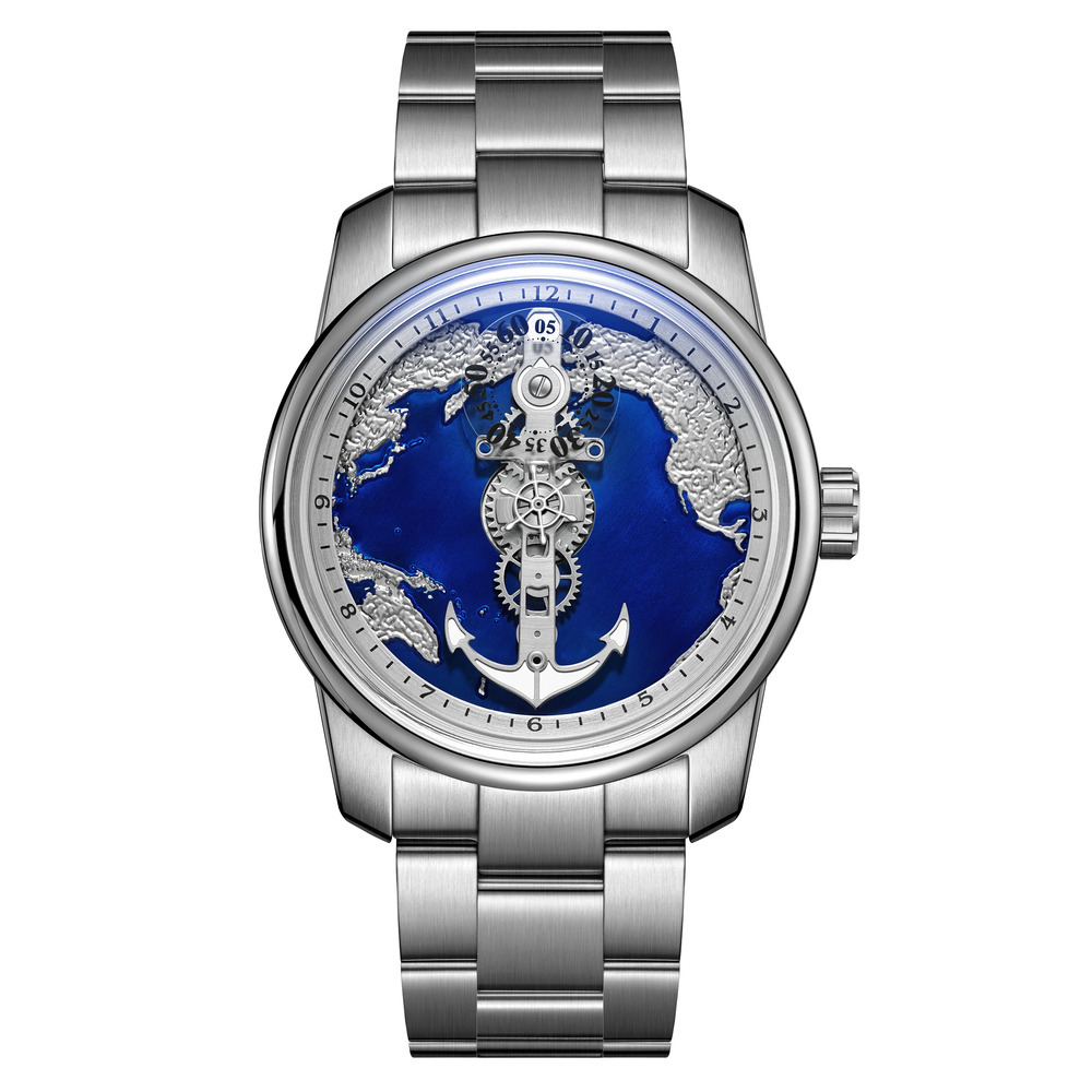 位於錶盤視覺焦點的中央的獨特航海方向盤,舵輪隨時間緩緩轉動,象徵著「掌握方向,無懼風浪」。每一次目光停留在錶盤上,都能感受到機械律動帶來的心跳感。巨大的銀色船錨在藍色海域上穩定運行,它的造型雄渾有力,代表著堅韌不拔的精神與穩定的內在。
