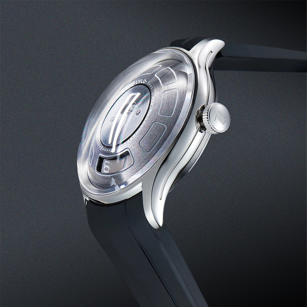 幽浮系列外觀設計俐落簡潔,展現出「非地球製造」的未來科技感,摒棄傳統錶盤與時針,而是透過迴轉盤數字窗口顯示小時與分鐘,設計靈感源自外星飛行艙儀表。整體採用懸浮式指針結構,與中心渦輪刻紋結合,模擬飛碟起飛時的能量旋渦感。從正面觀賞,如同觀察一枚異星探測艙。從側面看,厚實卻優雅的錶殼線條,彷彿模擬飛行器進出次元通道的空氣動力學設計。