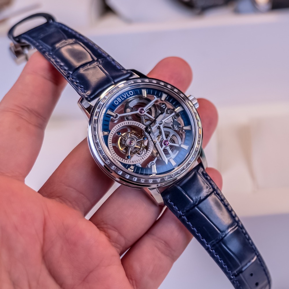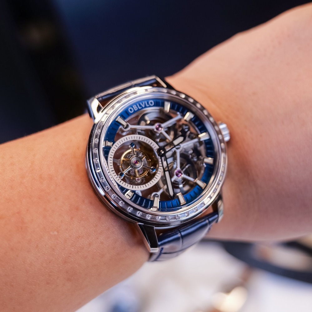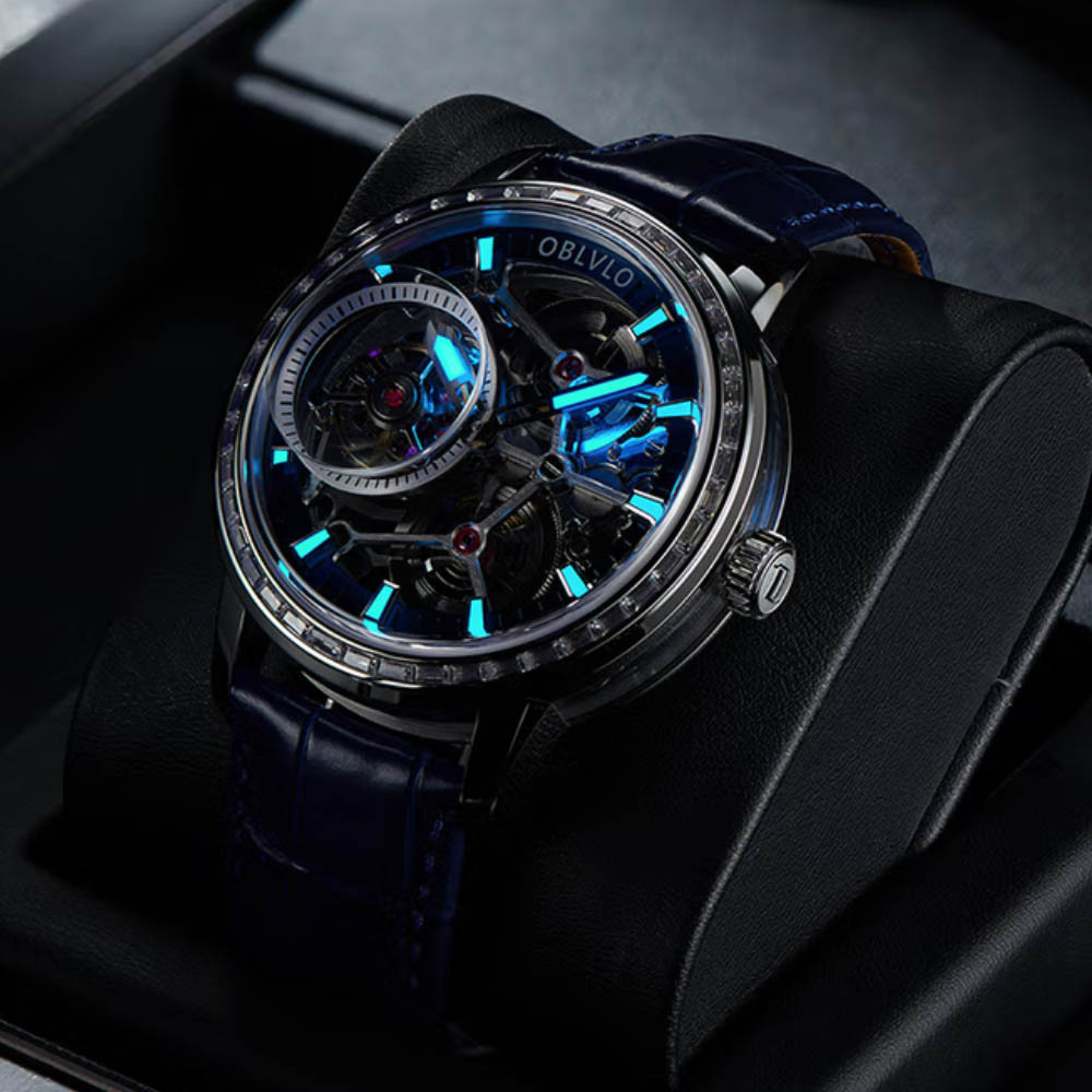 OBLVLO 歐弗洛【立體解構】方鑽陀飛輪系列,以解構美學為設計靈感,鏤空機芯設計徹底展現機械結構之美,每一個齒輪的轉動、每一條橋板的佈局,皆透過通透的鏤空表盤一覽無遺。而錶圈外緣巧妙鑲嵌施華洛世奇水鑽,呈現璀璨卻不過於張揚的光澤。走在光影交錯之間,展現獨有的格調與自信。這不僅讓配戴者得以親眼目睹時間的運作軌跡,更象徵著內斂卻強大的力量,是一件可佩戴的機械藝術品,更是一種時間哲學的體現。