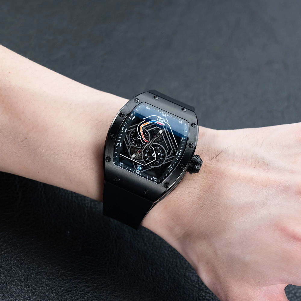 運動美學不應以犧牲舒適為代價。為了匹配「賽道系列」的高能表現,選用了高品質的氟橡膠錶帶。這種材質常用於超級賽車的密封組件,具有防汗、防水、親膚且極其耐磨的特性。無論是駕駛室內的激烈操駕,還是商務派對上的優雅交流,它都能完美契合你的手腕線條。搭配獨特設計的賽車螺絲裝飾錶圈,每一個細節都在宣告:速度,是我的基因。