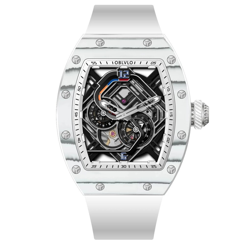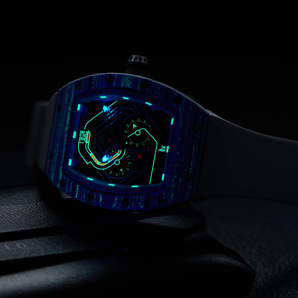 OBLVLO歐弗洛【賽道系列】打破了傳統錶盤的封閉感,採用多層次疊加結構,構築出一條充滿未來感的「微型賽道」。在喧囂的城市街頭,有一種節奏不屬於紅綠燈的跳躍,而屬於引擎的低吼與活塞的律動。對我們而言,時間不只是指針的旋轉,而是轉速錶盤上每一度攀升的快感,是輪胎與地面摩擦出的火花。碳纖與暗夜流光的交響是在時光賽道上,永不落幕的熱血。