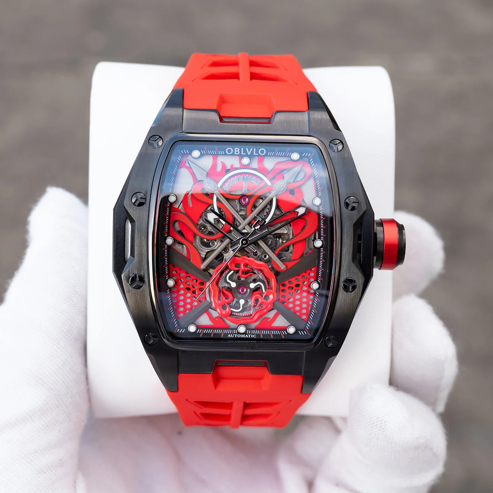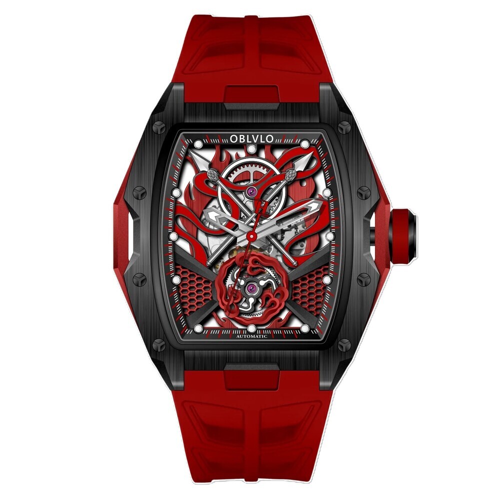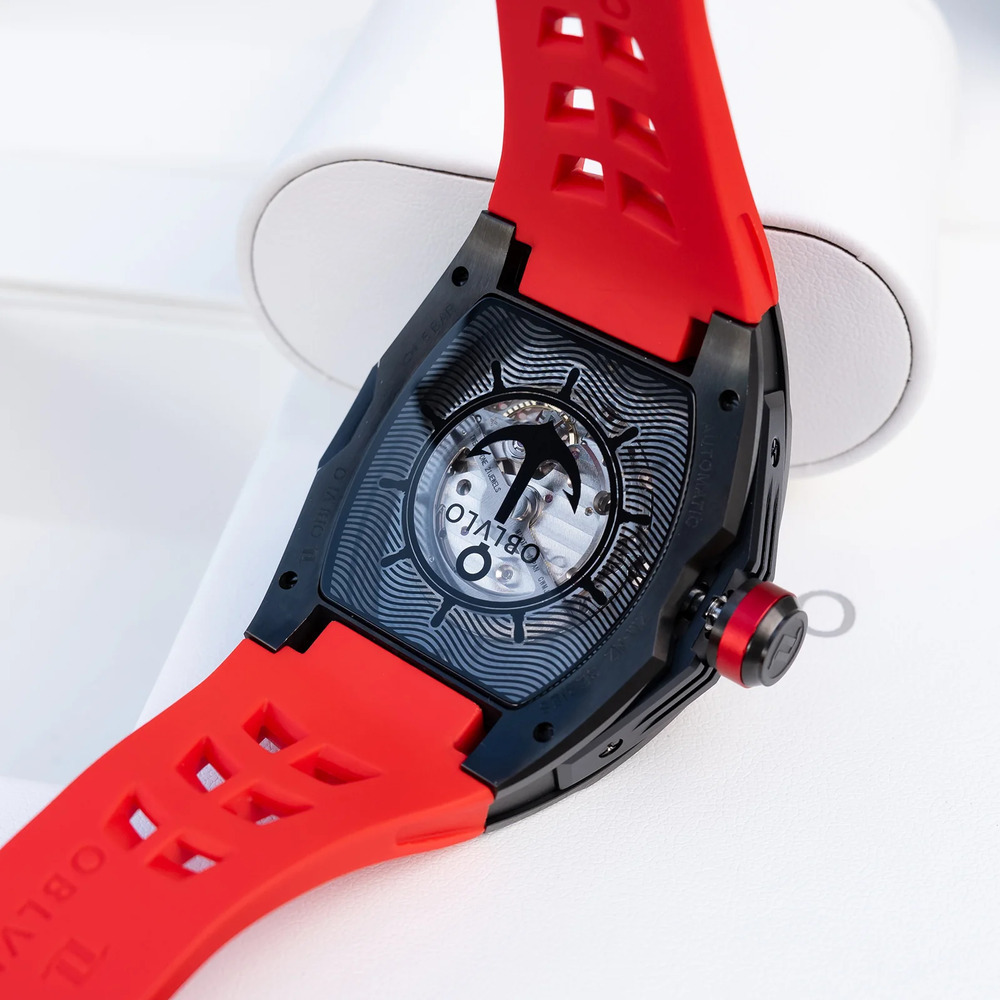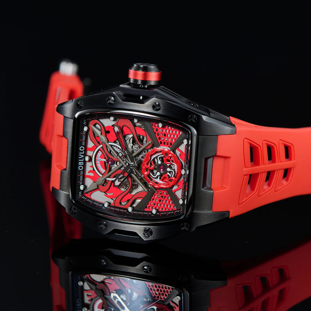 烈焰紅代表了神祇的高貴與血緣的尊崇,而黑色磨砂噴塗則賦予了腕錶沉穩與神祕的戰鬥氣息。錶殼上的六枚五角星狀螺絲,既是結構的支撐,也像是戰甲上的鉚釘,展現出強烈的機械感與工業風。搭配一體化的高級橡膠錶帶,不僅具備卓越的佩戴舒適度,更展現出城市極客與現代戰士的潮流風範。