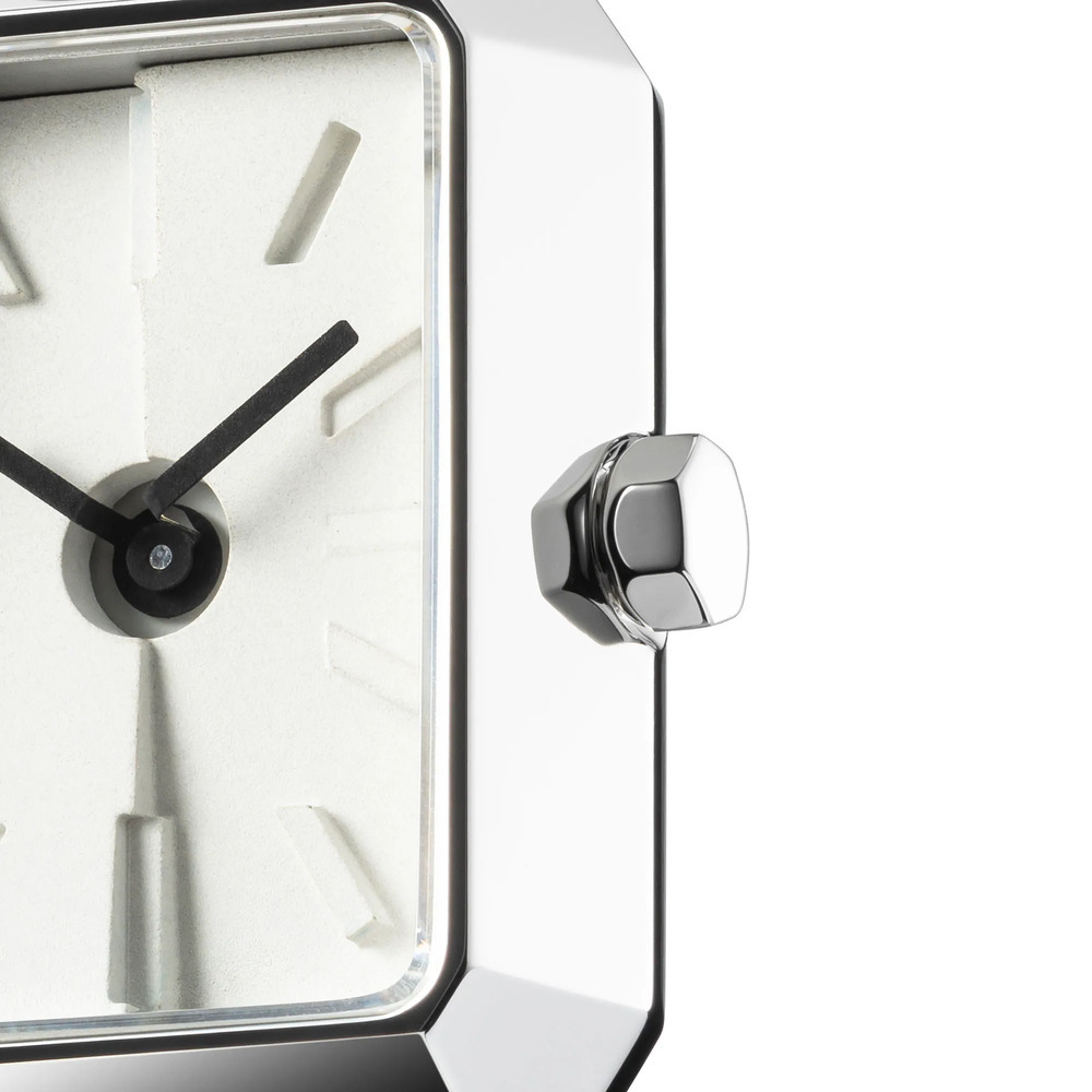 跳脫傳統方錶四邊形的窠臼,設計靈感來自幾何雕塑(geometry sculpture),整支錶是由20個鏡面組成結構,不同角度隨時反射周遭景色。配戴上手,閃閃發亮!腕錶的尺寸剛好符合手腕寬度,錶帶自然垂墜將手錶固定於手腕上,角度呼應錶殼側邊的線條,配戴非常舒適。