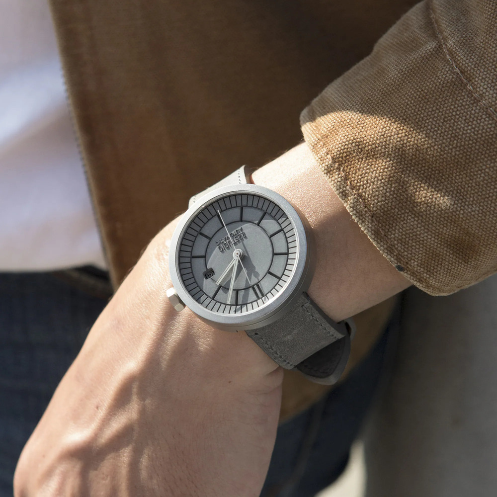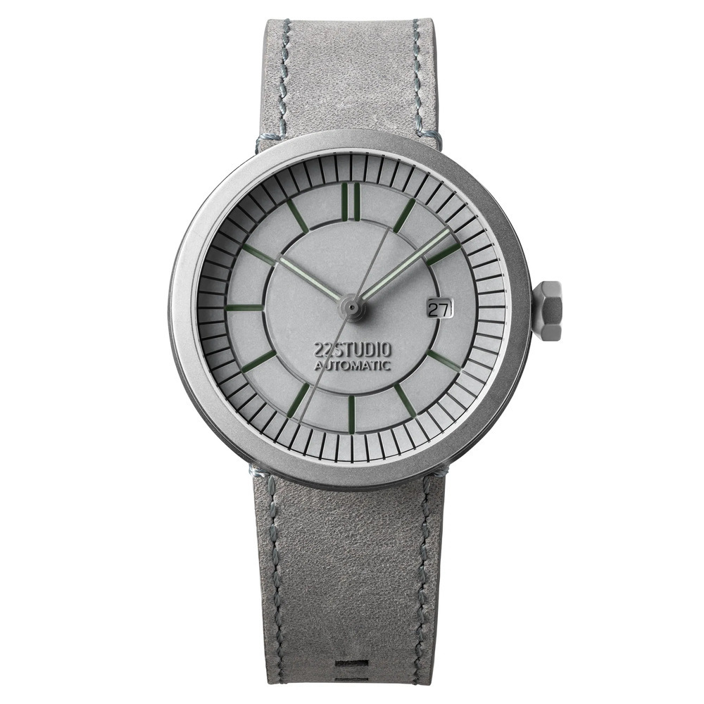 灰的純粹、單一極簡,無疑以「水泥」為設計基因的22STUDIO原生執迷。水泥灰款,展現不同材質──水泥、不鏽鋼、皮革元素之間,灰的層次。少了顏色的干擾,手錶本身的造型線條可以最清楚的呈現出來,同時指針與錶盤綠色的超級夜光塗料更被灰色背景襯托出來。