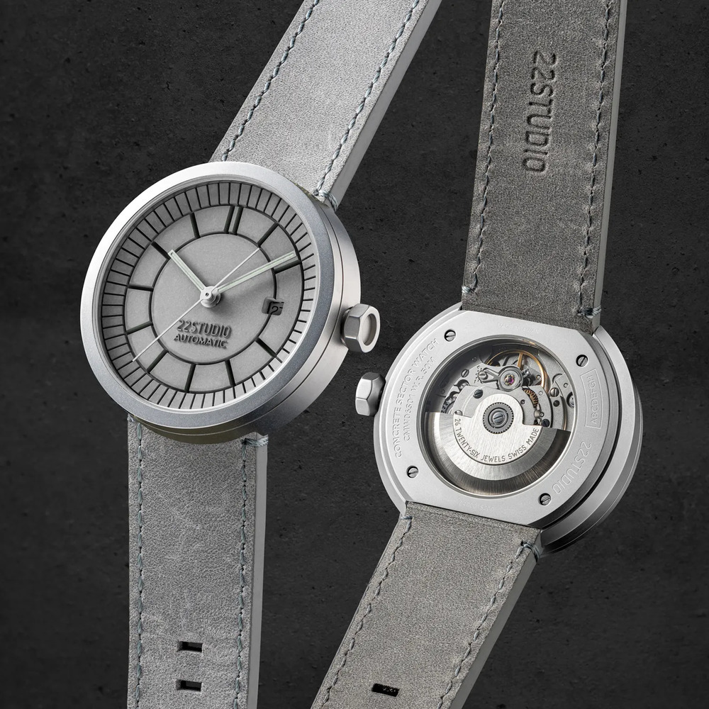 錶盤以22STUDIO獨家的水泥工藝製造,立體凹槽切割出放射狀 12 與 60 等分,用切割造成的陰影作為時標,精準指示每一分一秒。 第22分鐘的水泥格微微高起,呼應22品牌名稱,且配戴者才知道的幽微默契。