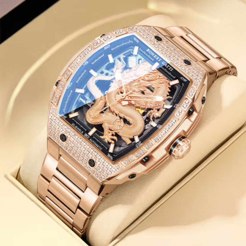 Bonest Gatti 【騰龍系列】延續「都會系列」廣受好評的酒桶形錶殼,錶面設計為蟠龍騰雲駕霧,神動形移,似欲破錶而出,指針的尖頭採用夜光塗層,時分針運作時如同赤焰龍珠,環繞升龍而行;畫龍點睛,雙目綴以夜光漆,瞠目張頷,威風凜然。
