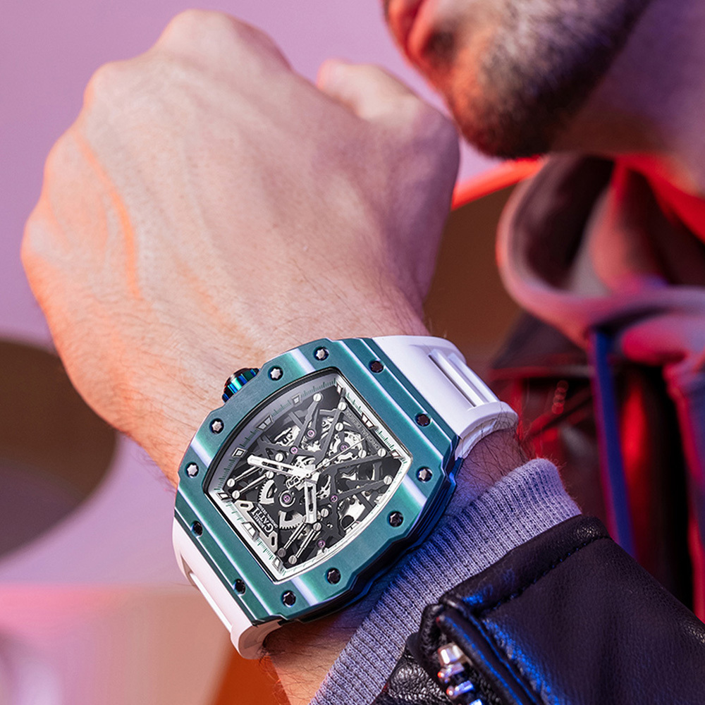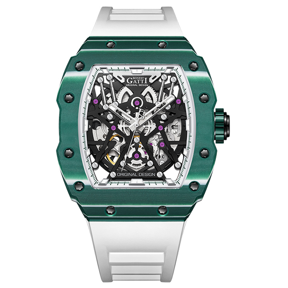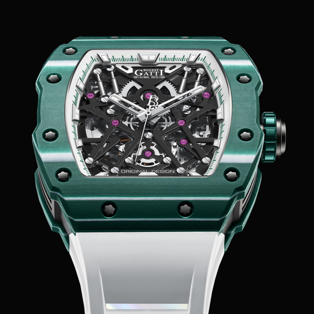 Bonest Gatti 【寶加地腕錶】結合運動與輕奢的腕錶美學,以最能奪人目光,獨特稀有且勇於展現自我的潮流設計!碳纖魅影系列的酒桶形錶殼獨樹一幟,在設計上承繼品牌德式製錶的工藝精髓,以多層次立體疊砌的方式,為錶款賦予最穩固的結構。上錶圈及底蓋邊框使用與錶款同名的碳纖維材質打造,中殼部分則使用航太領域的高科技鈦合金材質,同時兼顧輕盈及耐用雙重特性!