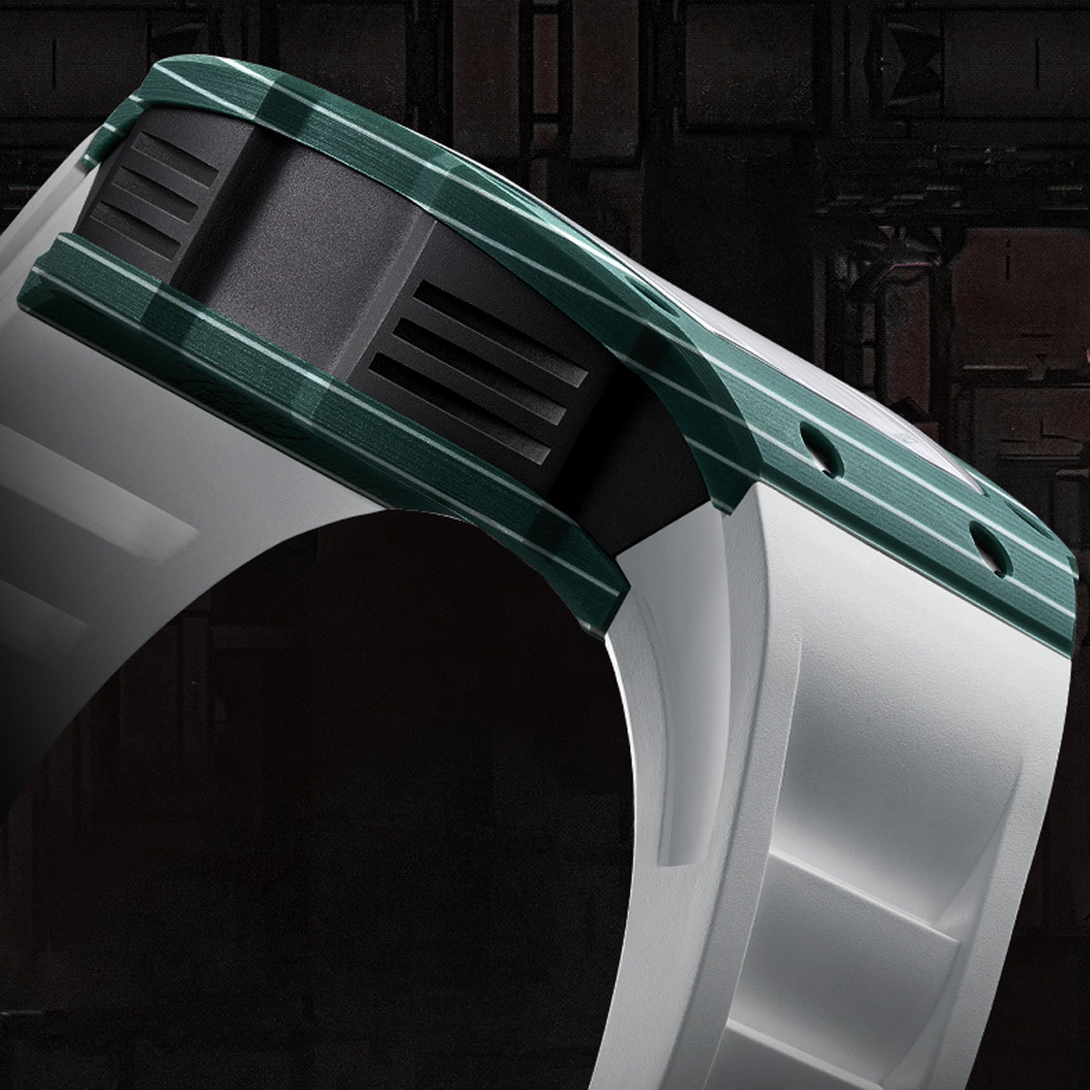 碳纖魅影】共有黑色、紫色、綠色、白色等四色錶款,提供熱愛賽車的錶迷不同選擇。其中黑色錶款以碳纖維原色呈現,搭配黑色橡膠錶帶,展現低調奢華的質感;紫色及綠色錶款則是為碳纖維電鍍一層金屬光澤,搭配白色橡膠錶帶,營造出賽車般搶眼的視覺效果;白色錶款最為特別,使用少見的夜光碳纖維材質,在夜晚特別醒目,這是向賽車上同樣也相當重要的照明科技致敬,為前方指引最明亮的道路。