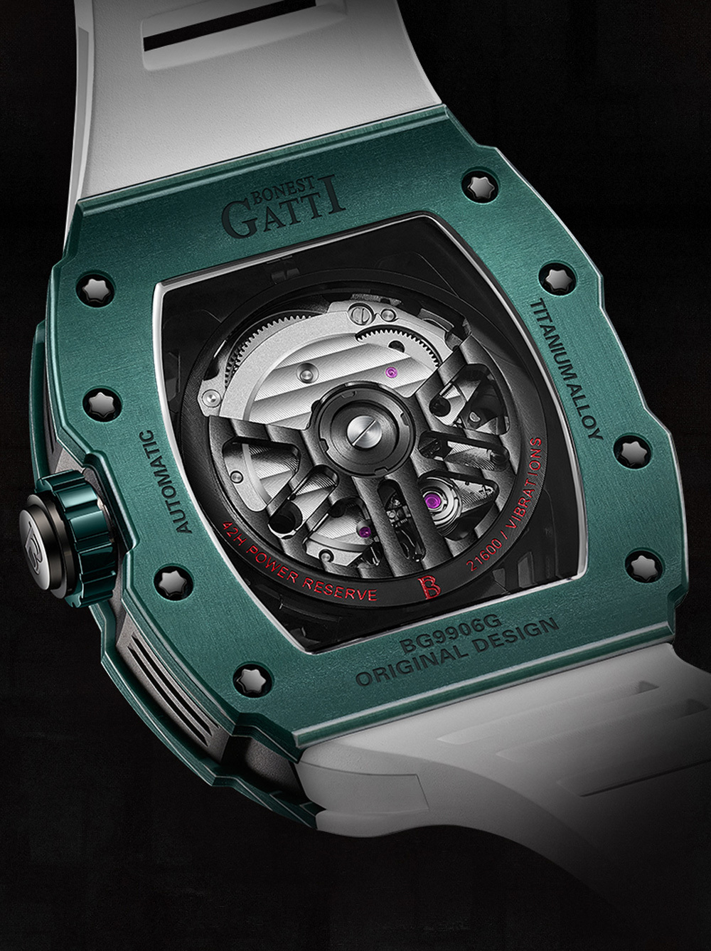 BONEST GATTI 以新潮立體大膽的設計風格,來打造魅影】系列的酒桶形外觀,其中最吸睛的莫過於錶殼兩側垂直的勾槽紋路,取材超跑的流線工藝,而氟化橡膠錶帶輕盈服貼的特性,更是展現超跑向來追求輕量化與高速貼背感的舒適性旗艦系列的【碳纖魅影】在設計上承繼品牌高端製錶的工藝精髓,以多層次立體疊砌的方式,為錶款賦予最穩固的結構。上錶圈及底蓋邊框使用與錶款同名的碳纖維材質打造,中殼部分則使用航太領域的高科技鈦合金材質,同時兼顧輕盈及耐用雙重特性。