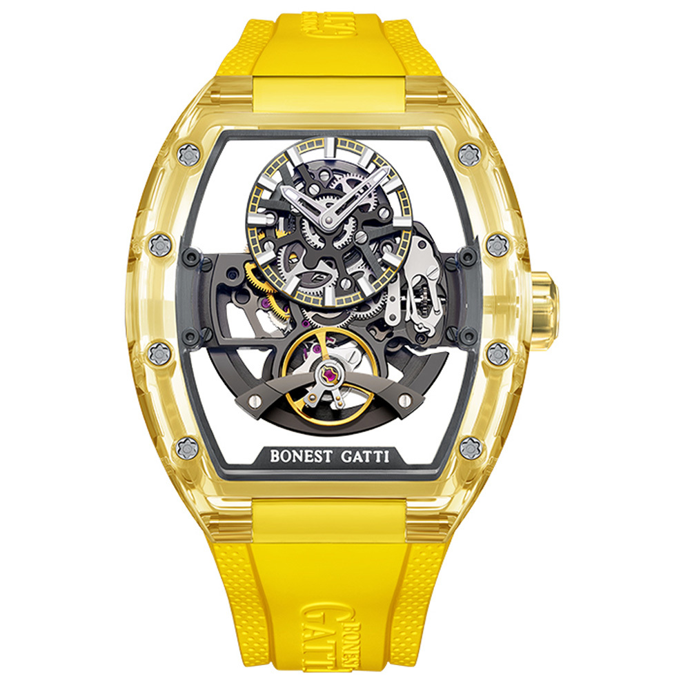 Bonest Gatti 【寶加地腕錶】結合運動與輕奢的腕錶美學,以最能奪人目光,獨特稀有且勇於展現自我的潮流設計!寶加地【晶鑽魅影】延續「魅影系列」廣受好評的酒桶形錶殼,整體視覺效果以賽車引擎為設計靈感來源,明亮通透的錶殼,井然有序的機械構造一覽無遺,前後鏤空的面盤如賽車引擎內部的汽缸設計繁複而優雅,六點鐘方向的擺輪裝置則象徵著蓄勢待發的爆發力。